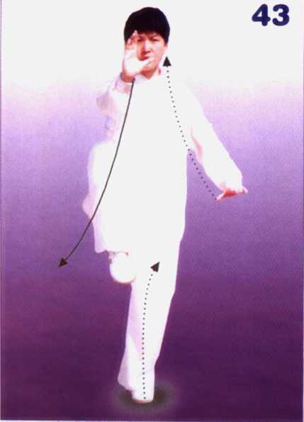(2) 左腿蹬地,身体立起,右 腿随即屈膝提起,成左独立势;同 时右掌向前上屈臂挑起,立于右腿 上方,肘与膝相对,手心向左,指 尖向上,高与鼻平;左手向左下划 弧至左胯旁,手心向下,指尖向前; 眼看右手(图43)。