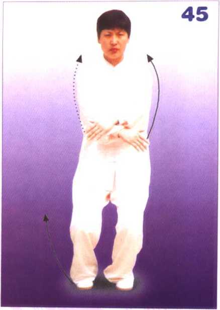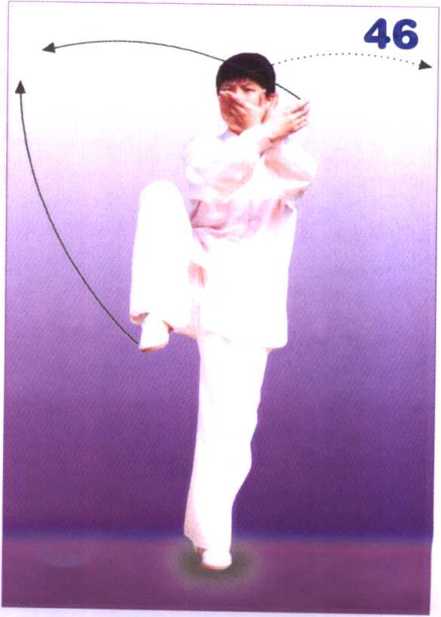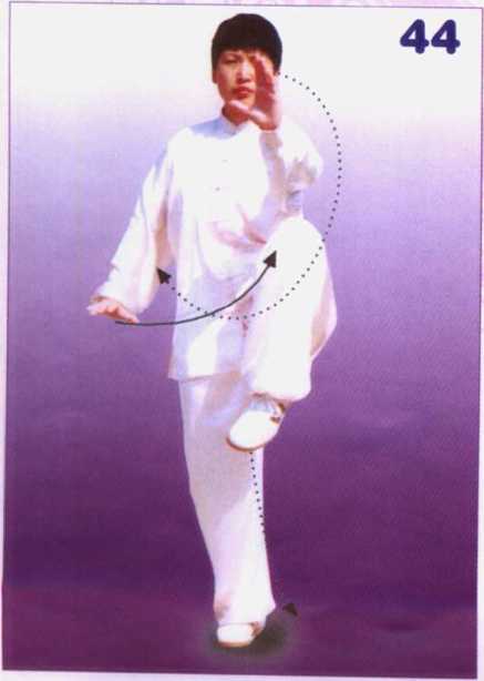 (3) 右脚下落,重心移至右腿, 随即左腿屈膝上提成右独立势;同 时左掌由下向前、向上挑起,立于 左腿上方,肘与膝相对,手心向右, 指尖向上,高与鼻平;右手向下划 弧落于右胯旁,手心向下;眼看左 手(图44)。