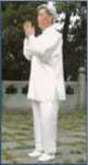接前式两手再由两侧上扬回抱合掌收于胸前指尖与鼻尖对齐再如上式行吐纳三五口。