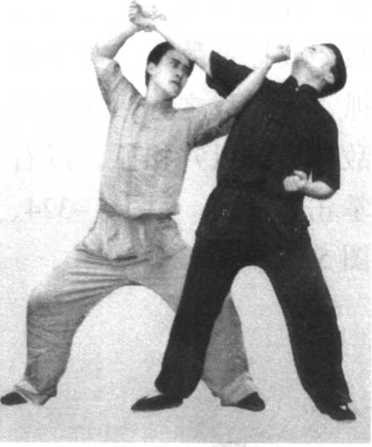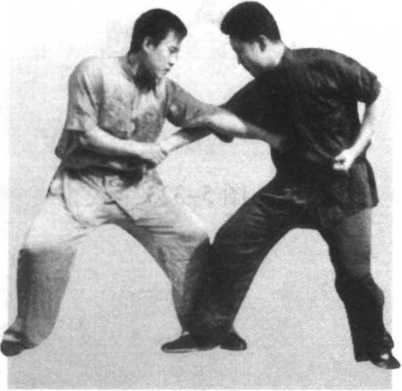 敌打来右拳,我右手叼敌臂。上步近敌,以左手在右手上 方向钻拳击敌腹;敌用手上封,我右手反叼敌臂并上挑,也可 用原已叼之臂上架或扔出,左手就势抽出,侧身向敌下颌打 击。其余为挑打用法。(图5-321、图5-322)