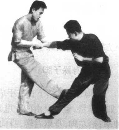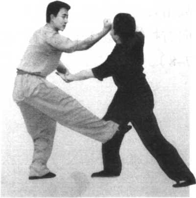 跺子脚:敌我相对较 近,敌以一拳击我,我双手 掳敌臂后拉,顺势以后脚外 展背屈向敌膝踹踩,并顺势 向前移身,脚随身势向敌后 下踩,压敌腿,并顺势上 步,以损其膝。(图7-7)