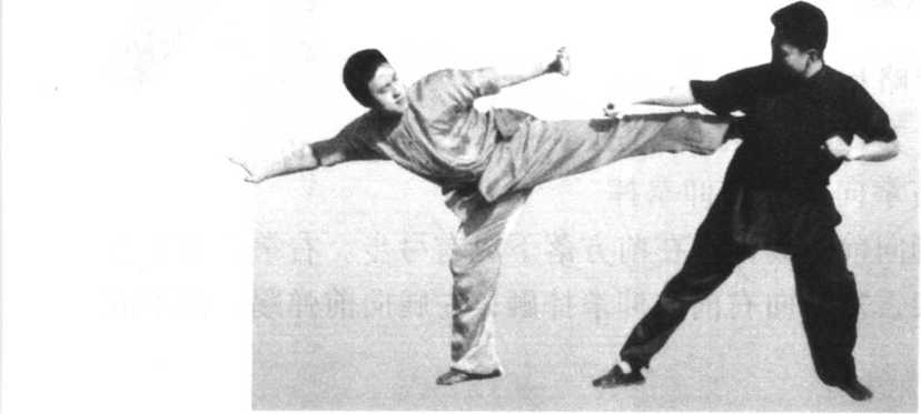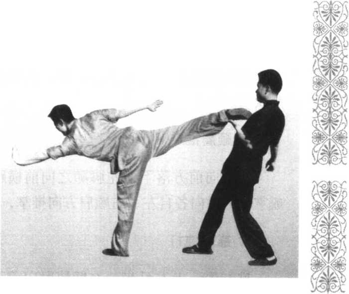 281点心脚:以脚 尖点击对方,用其 长。由后而击为出 其不意,尤其在敌 追击我时更为有 利。此势收腿应 快,以免为敌所 抓。(图7-9)
