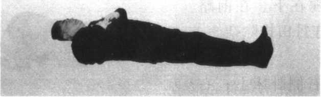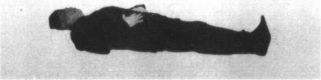 73仰卧于床上,两脚并拢,脚尖微向内收,全身挺直;气沉 丹田(脐下与会阴之中点)后,两掌自丹田徐徐推摸至乳部。 (图 4-1 )