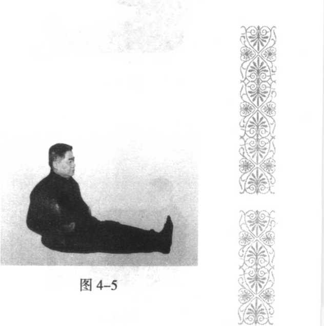 1. 坐式。两腿直伸, 两脚并拢,两脚用力背屈 (向脚背方向勾起),头、 腰挺直;意守丹田,裆要 紧合;两臂贴身两侧,屈 肘90°左右,两手握拳。 (图 4一 5 )