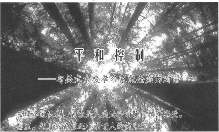 王培生先生曾经大力提倡将现代的信息论、系统论和控制论 与太极拳传统理论相结合,进行太极拳的研究和实践。张全亮先 生得其太极精华,并与八卦等内家功夫相结合,变中求衡?动中 求静,于不动声色中呈展拿吞吐之象,得平和控制之化境。