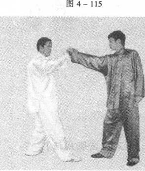 (一)甲乙面对而立。甲方右脚在前。乙方进右步同时,向甲方胸部冲右拳目视甲方。(图4-115)