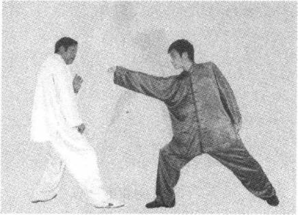 用法简介(一)甲乙相对而站。乙方进右步屈膝半蹲左腿挺膝蹬直成右弓步同时右拳向甲面部冲击拳心朝下目视右拳。甲右腿在前稍屈左腿屈膝成右高虚步左掌护于左胸前,掌心向右右手自然下垂目视乙方准备接招。(图4-145)图4-145