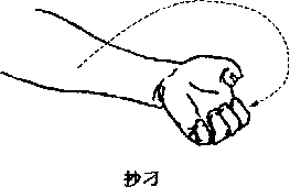 右(左)掌向上、向外、向下、向上绕环变爪抓刁爪心向上爪口向前力贯五指右(左)臂微屈叫抄刁。(图3-7)图3-7
