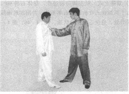 (一)甲乙面对而立。乙进右步同时用右手抓住甲的胸部目视甲方。(图4-44)