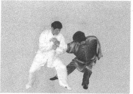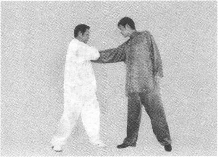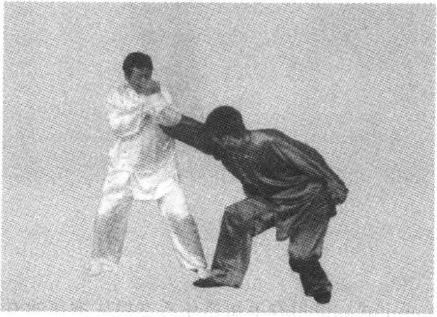 (三)进步侧身并巧运左肘滚压对方之腕、臂关节。通过侧身对方左手的威力减多半加之右手的抓扣动作对方只得伏地就擒这也是鹰爪门擒拿术错骨之妙也。