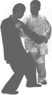 腿掩膝冲扣进身的同时,左 臂随势掳按乙之左腕,右臂 向右往上弧线滚臂冲点其喉 部。乙方身体后仰,避开甲 之右掌的冲点,左臂处于被 折状态。(图3-32用法)
