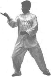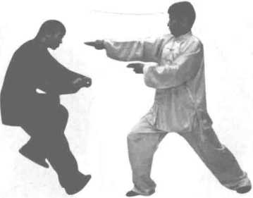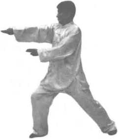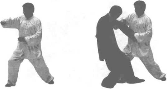 这是个缠折冲点、拧身钻扎的招术。在右腿抬起的同时缠 拢,在落步前扣进身的同时双掌掳按冲点,形成柔刚相济的旋 冲之势。拧身钻扎是缠折冲点的续势招术,要求动作连续,随 势而行C
