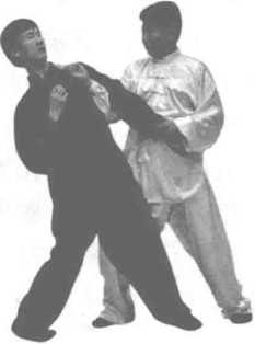 在用法上,针对乙方进身左臂的劈打,甲方以右臂的弧线 滚臂旋缠应对之。右臂的弧线旋缠要影响其身体重心,在其被 动之时,右腿向前冲扣进身,右臂冲点其喉部;在其后仰躲闪 时,甲方随势拧身滚臂钻扎之。