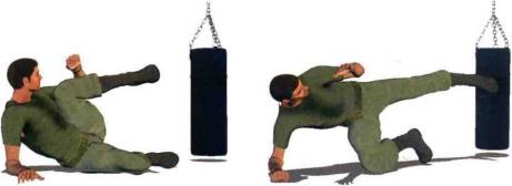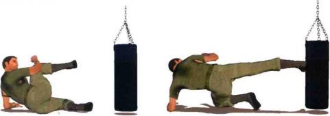 (2) 当敌人迈步逼近时我迅速用左臂推撑地面身体重心猛然提起以左脚、左膝和左小臂接触地面、支撑身体令上体悬空。同时腰髓左旋内扣右腿猛然挺膝向右侧水平踹出以脚底或脚后跟为力点袭击对方前腿膝盖或者小腿胫骨部位(图1-5-59)