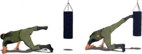 以色列国防军格斗技术全解 地面打斗以色列国防军格斗技术全解 地面打斗(2) 发动攻击时左臂用力推撑地面身体重心猛然提起以左脚、左膝和左小臂接触地面、支撑身体令上体悬空。同时腰髓左旋内扣右腿猛然挺膝右脚向右侧水平踹击沙包中部(图1-5-53)左臂推撑地面可以产生反作用力加大冲击力度使攻击更加凶狠有效。