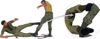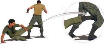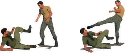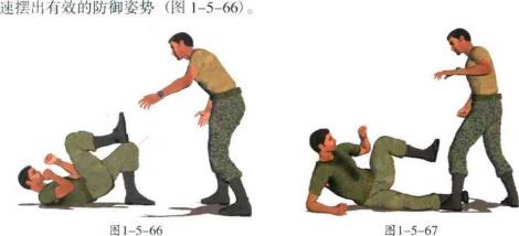 (1) 当我身体右侧躺于地面时迅速将左腿屈膝抬起左脚朝向敌人迅速摆出有效的防御姿势(图1-5-63)