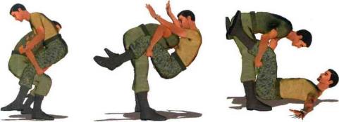 (4) 继而利用身体前冲的冲撞力双手用力向后上方提拉对方双腿迫使对方双脚脱离地面、悬空而起(图1-7-4)。