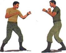 (1) 双方对峙敌人跃跃欲试准备前扑用左手刺拳攻击我上盘(图1-7-1)