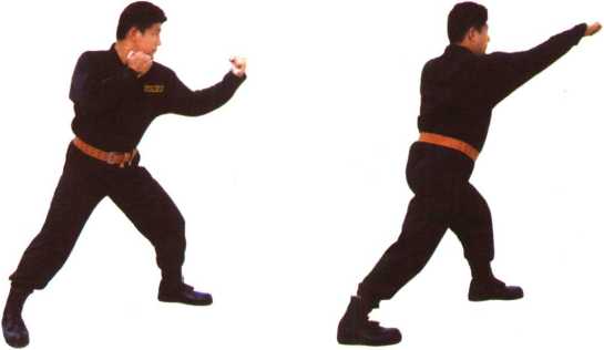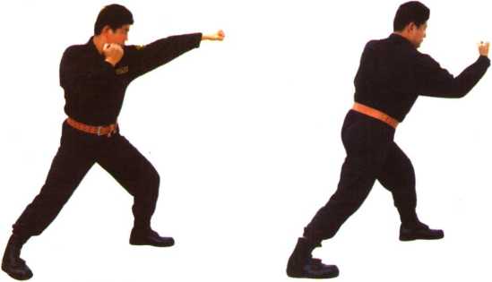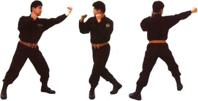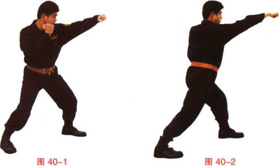 6,左弹拳——转身右鞭拳(图41-1、图41-2、图41-3)。
