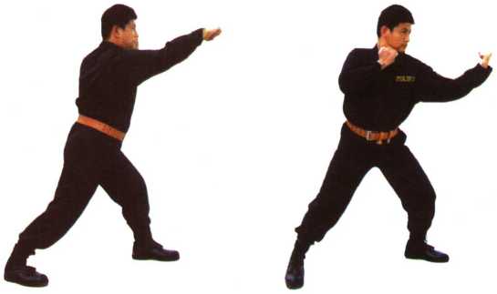 9 左直拳——右勾拳(图44-1、图44-2)。
