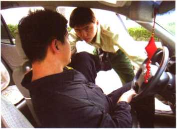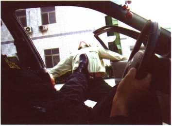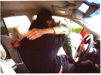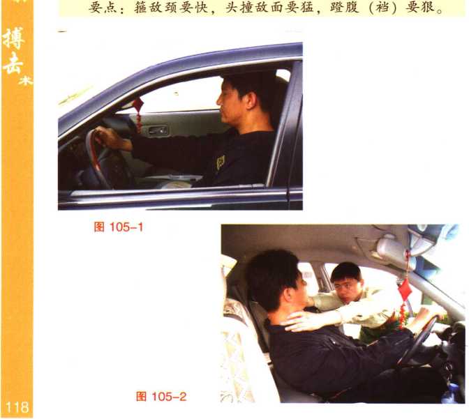 (图105-1),突然车门被一打开敌两手抓我双肩或掐住我脖子(图105-2)及 2我迅速左转身双手从敌双臂内侧穿过箍住敌颈部能并用力下拉随即用坚硬的前额猛力撞击敌面门(图105-制3) 3身体后仰疾起左脚猛蹬敌裆或腹部将其摔出车外和(图105-4、图105-5)。3招制敌(4。招)图105-3图105-4
