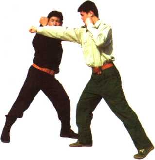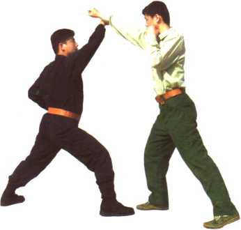 (1)在与敌格斗中敌右脚在前用右拳直击我面部或胸部时我立即向左侧上左步右臂屈平举用右小臂由里向外格挡其右小臂(图17-1)。