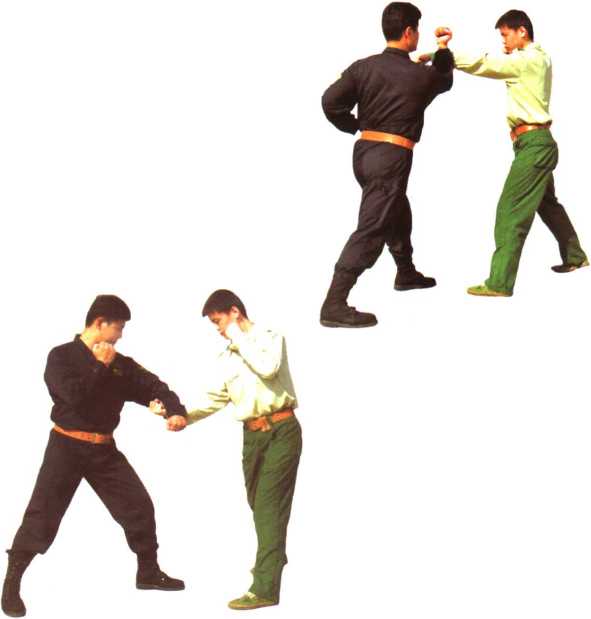 以左臂为例(1)当敌用右勾拳击我腹部时我左臂屈肘用小臂由上向下格压敌右小臂(图18-1)