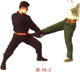 (2)当敌起右腿弹踢我裆部时我立即向后撤右步两腿微屈左臂屈肘用小臂由上向下格压敌右脚(图18-2)