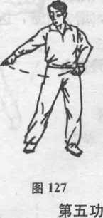 动作:右手拇指分开,另四指并拢,劲自下而上发于脚跟而 贯通至掌指,用内劲向前平推,推到尽头后放松翻掌向下(图 127),向左手方向划弧,在左手上约十公分处两手“劳宫”穴相对 (图128),停2至3秒钟,然后沿原路返回,至手臂伸直时再翻 掌向上,收回腰际仍成待发势。左手动作同上,一左一右各做一 次为一遍,共做七遍。