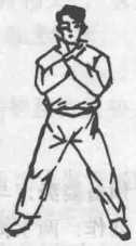 预备姿势:左脚向左横跨一 大步,重心在两脚之间;两手腕 交叉于胸前约十公分处,上缺口 对“天突”穴,指尖朝上(图 131).
