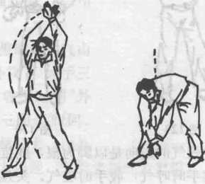 动作:手指朝上,用内劲向 上举起直插云霄,双臂伸直(图 132),同时吸气;用力徐徐朝前 下方成弧形劈下(图133),同 时呼气;略停1?3秒,双手从 裆下直线缓缓向上提至胸前,同时吸气;直腰, 朝上,恢复预备姿势,同时呼气。做七遍。