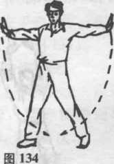 图137),停1?3秒钟,再放松,徐徐下落,恢复原势,同时呼 气。做七遍。