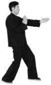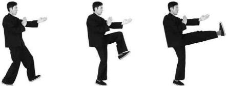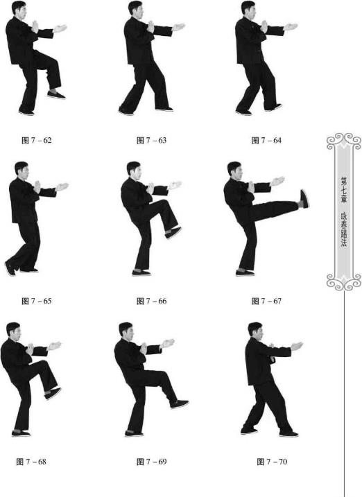 2 图7-58图7-58图7-59图7-59图7-60图7-60图7-61图7-61进马右前撑腿接着左脚滑向前方成进马同时拖带右脚和身体向前以右脚跟或脚底为力点随势同时向中线前撑踹踢出左腿支撑稳定身体重心。动作完成后迅速收回右脚恢复开始的问手式(图7-64-图7-70)。