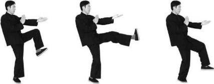 2 图7-179图7-179左十字腿然后身体适度放松身体重心偏向右脚支撑左脚原地屈膝上提脚尖朝外脚成横向身体借提膝的猝然动作将左脚向中线前撑踹出两手随势协调配合成防护动作呼气发力劲力达脚底或脚全掌眼视前方。动作完成迅速收脚恢复问手式(图7-180-图7-183)。