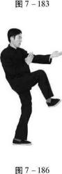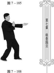 3 右十字腿由问手式开始其动作方法与左十字腿相同唯改右脚(后脚)做动作(图7-184-图7-188)。