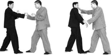 抓腕挟肘是典型的腕部擒拿法这种技术简捷有效它可对付被抓发、拍面、掐喉、劈打肩、击胸腹等攻击。