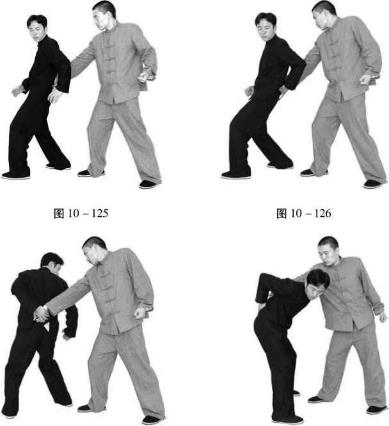 定身甲方与乙方对峙时乙方迅速绕至甲方背后偷袭甲方用右手抓住甲方后腰部。甲方迅疾屈膝定身保持重心稳固头向左转眼看乙方(图10-125)。