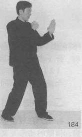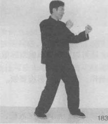 甲方与乙方交战迂回中(图180),甲方盯住乙方动向突然发出左手标指直戳乙方上路乙方反应欲上抬手防护(图181),甲方突然前伸右手成抵掌攻击乙方腹部(图182)。