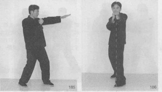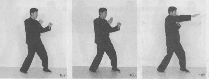 由摆桩起后手标指动作过程与前手动作相似唯用后手(右手)动作(图187-图