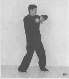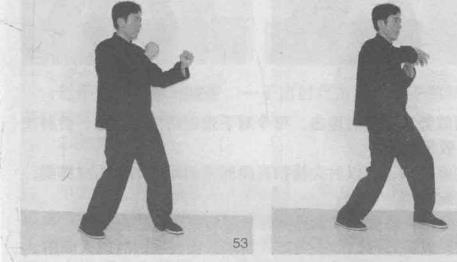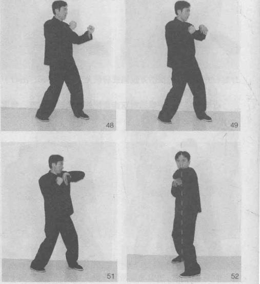 恢复摆桩桩式(图48-图51,图52为正视左手劈肘动作)。