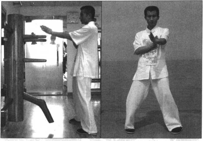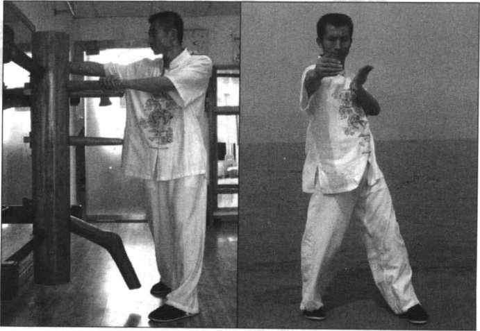 以“二字箝羊马”站立于木人桩前,左手向前伸出成“问手”,右手