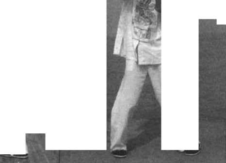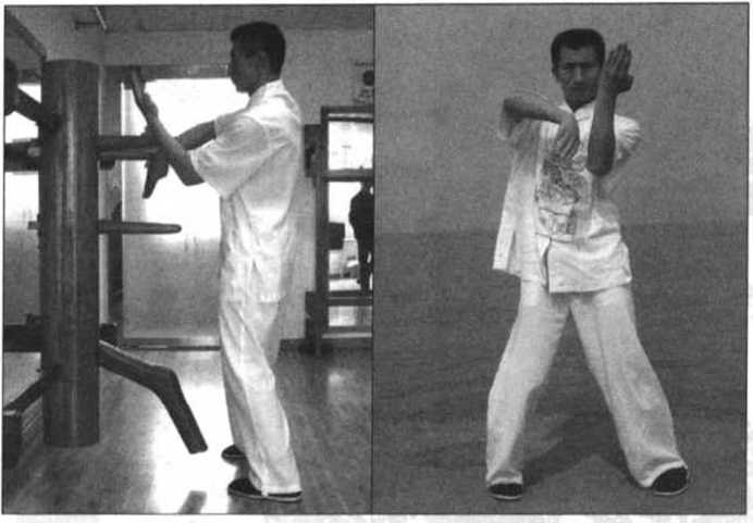随后,右手贴住木人桩的左臂而继续向内、向下勾压住木人桩的左 臂,左臂则同时从木人桩的右臂下绕并再向内侧格挡木人桩的右臂外侧, 以上几个动作我都是在用手臂紧紧贴住木人桩的手臂进行练习的,用来 练习近身搏击中 所特有的“粘劲” (图 1-48),(图 1-48附)为正面 示范。