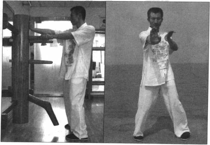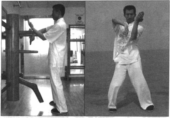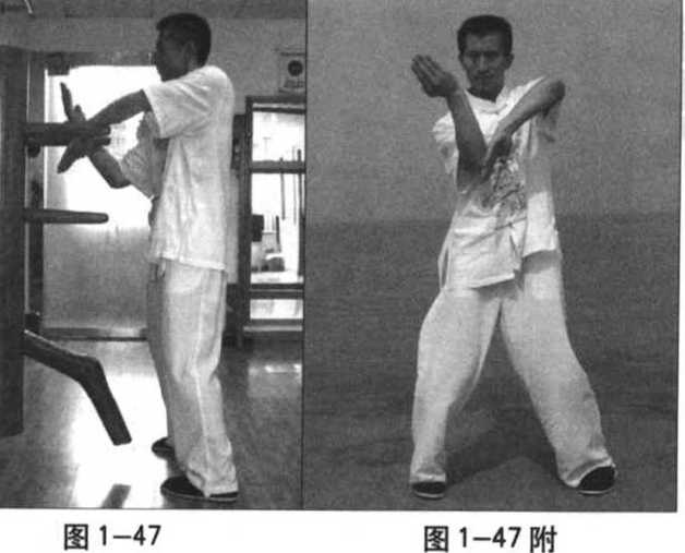 两手继续贴住木人桩的两臂滚动,使左手向内、向下贴住木人桩的 右臂并向下勾压住木人桩的右臂,我右臂则同时由内向下、向外再向上 侧格挡木人桩的左臂外侧(图1-47),(图1-47附)为正面示范。
