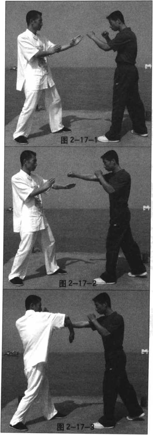 当对方同时出双拳向我上、 中盘攻来(图2-16-2);