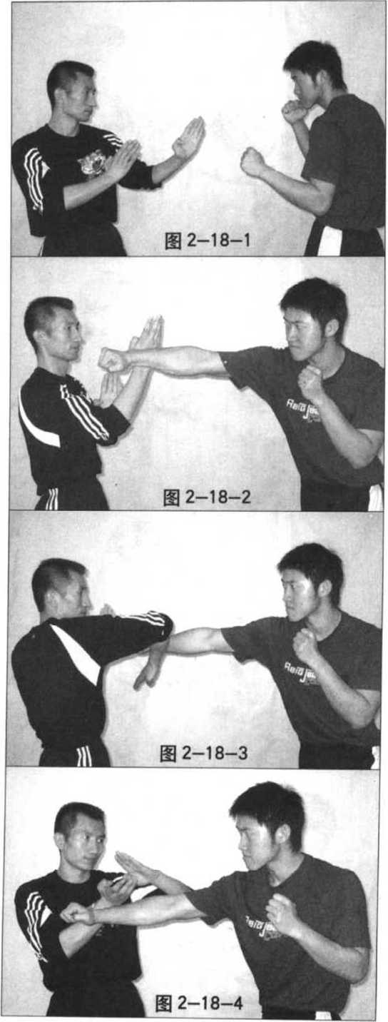 接下来,我右手贴住对方右 臂迅速向上、向右进行格挡(图 2-17-4),