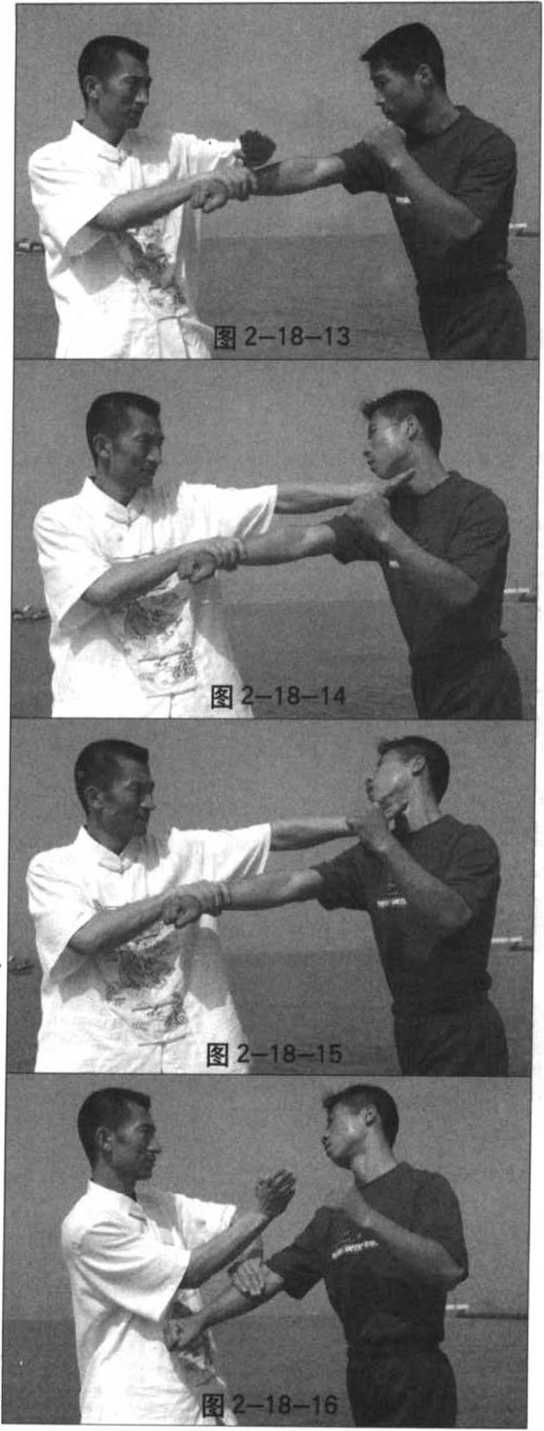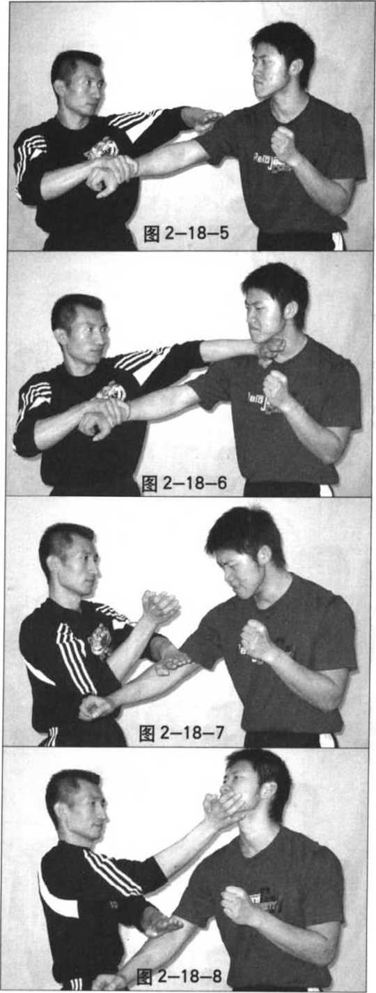 接下来,我右手贴住对 方右臂并迅速向上、向右侧 进行格挡,而且还须再顺势 向右方牵拉其右臂,致使其 右臂偏离原来的攻击方向 (图 2—18—4);