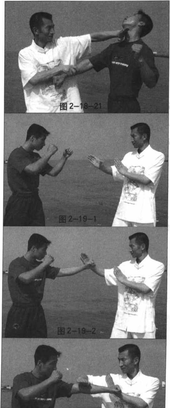 对方抢先用左拳向我上 盘攻来(图2-19-2),