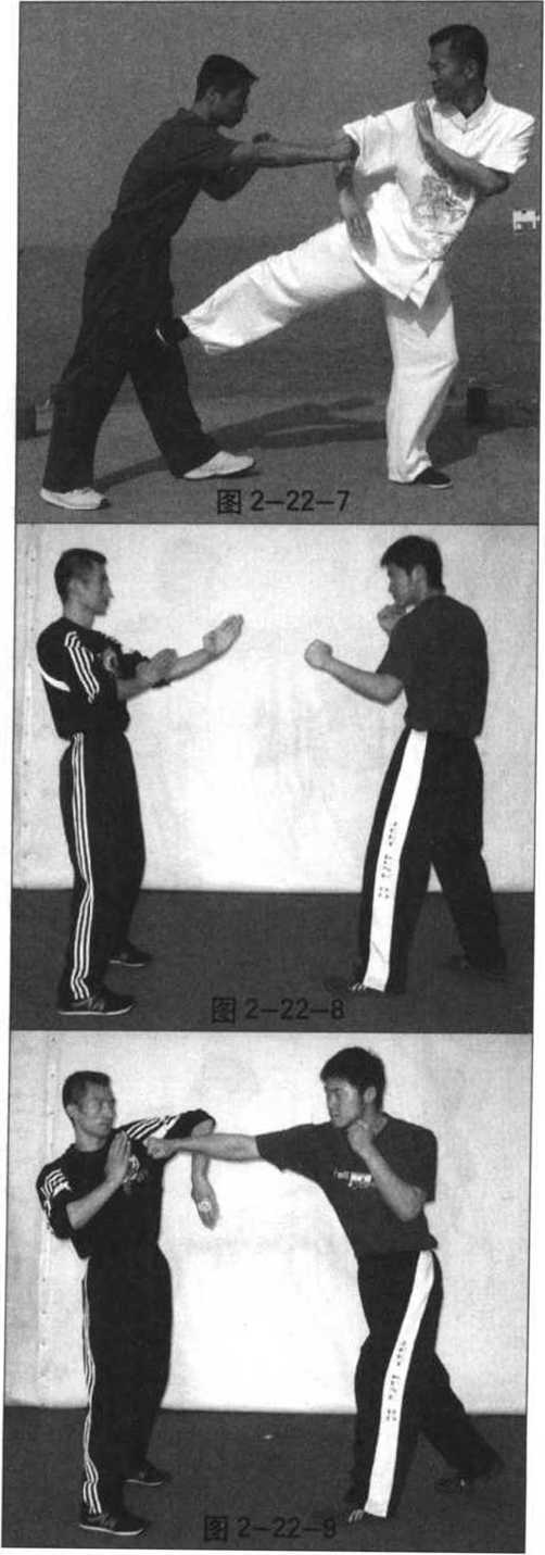 对方抢先用右拳向我方上 (中)盘攻来,我迅速用左手向 左(外)侧格挡对方右臂内侧, 化解其攻击(图2-22-2);