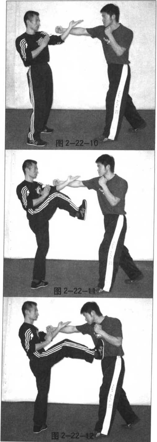 同时快速抬起右脚并果断 地直踹对方腹部(图2-22-11、 12),