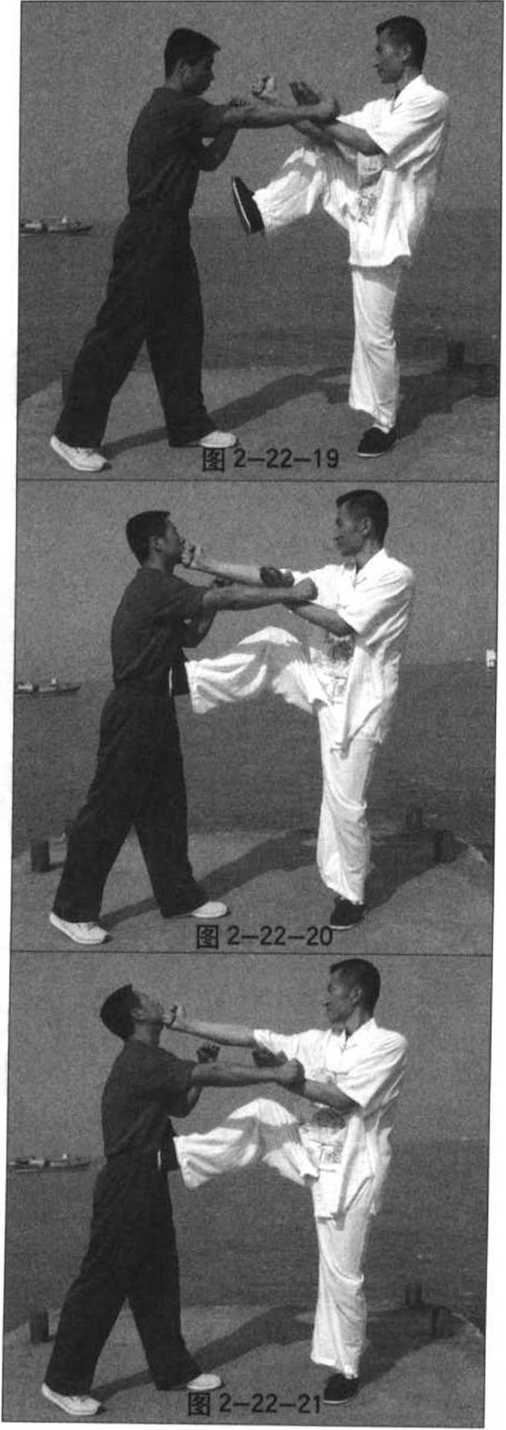 同时快速抬起右脚并果断 直踹对方腹部,这时我更为强劲 的右冲拳也同时击中了对方面 门处(图 2—22—19、20、21);